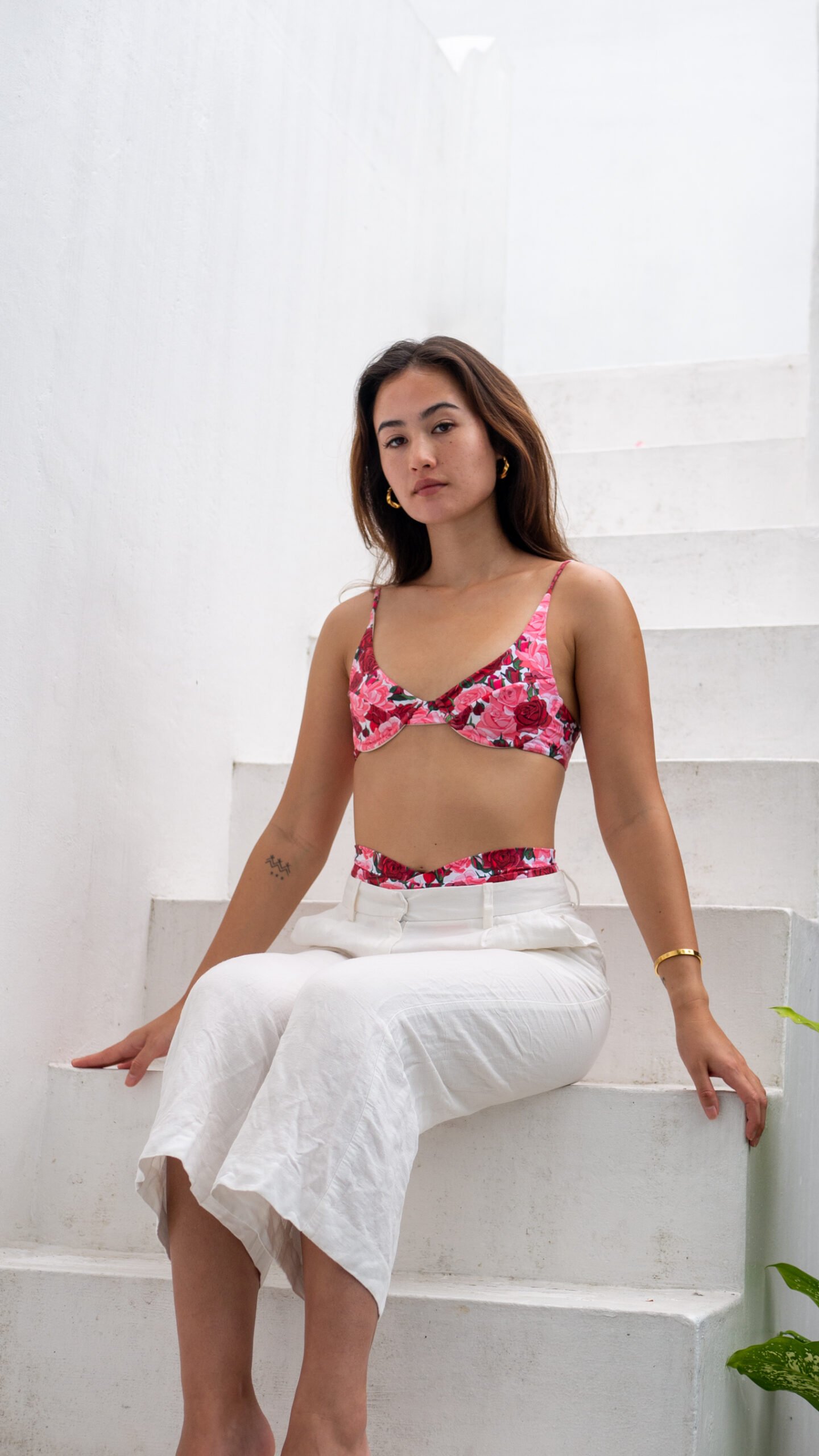 A Model 170cm magas, S felső és S alsó méretet visel
